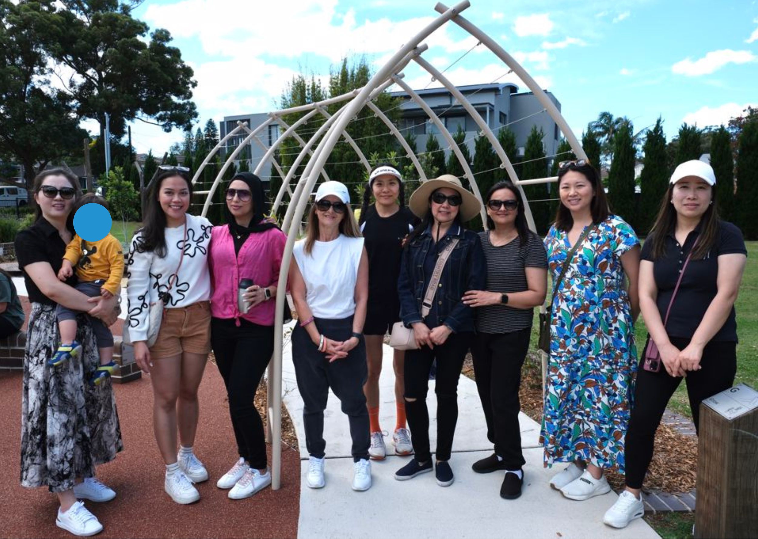 A group of nine educators posing outdoors under a decorative arch. They are dressed in casual, colourful clothing, with some wearing sunglasses and hats. One person is holding a child. The background features trees and a building under a blue sky.